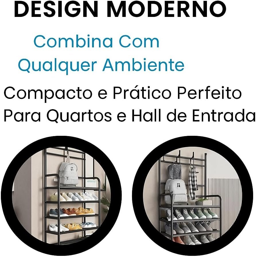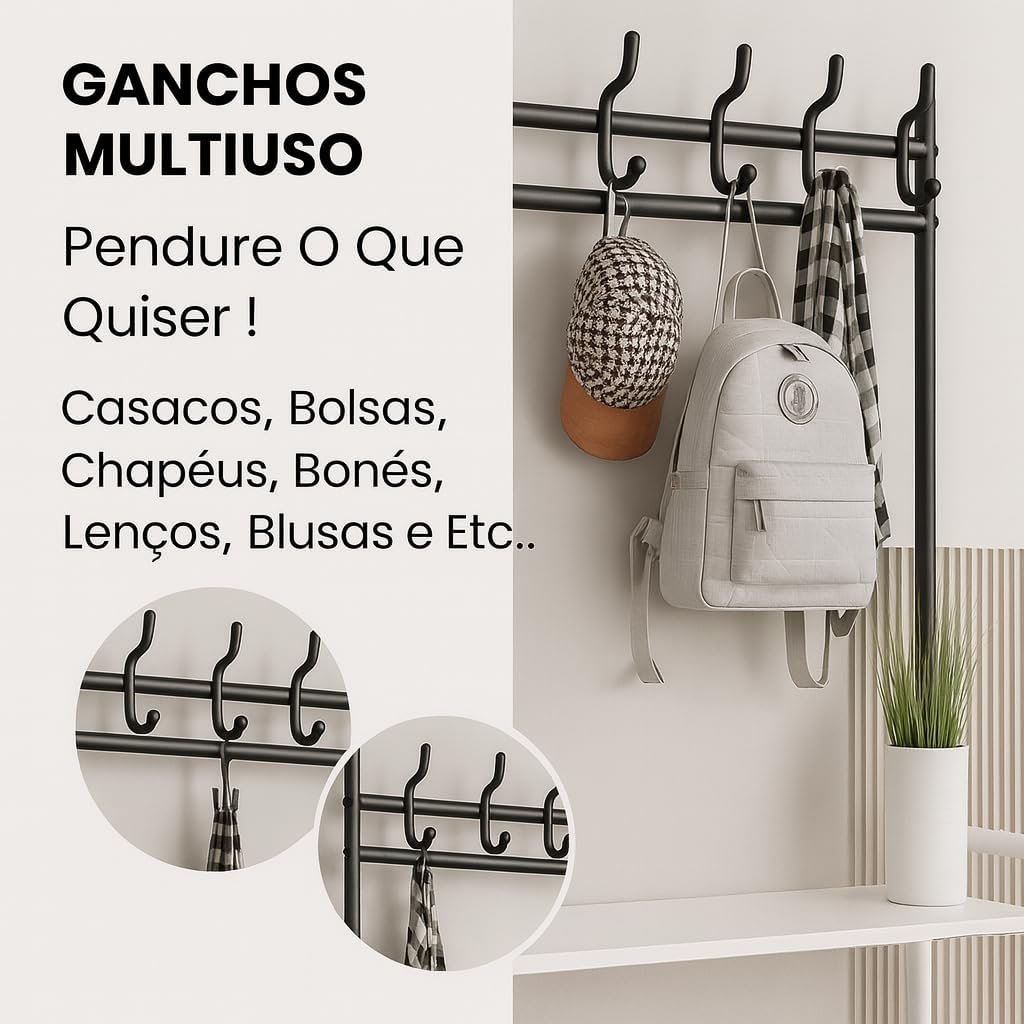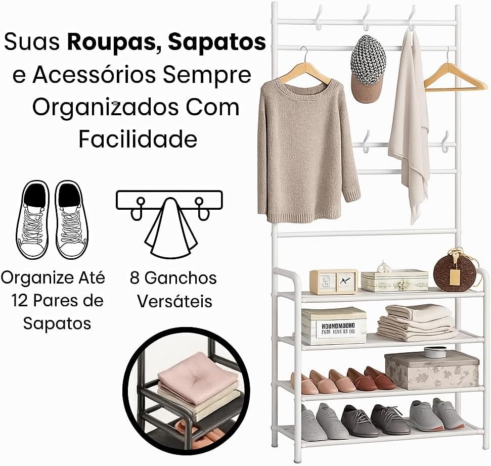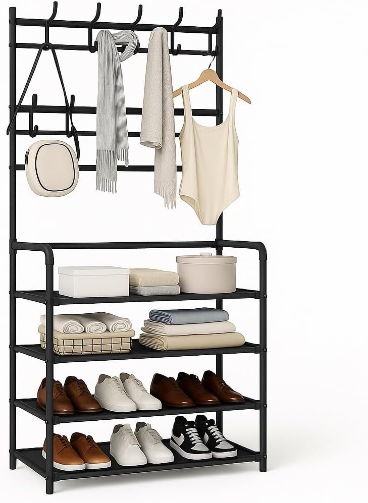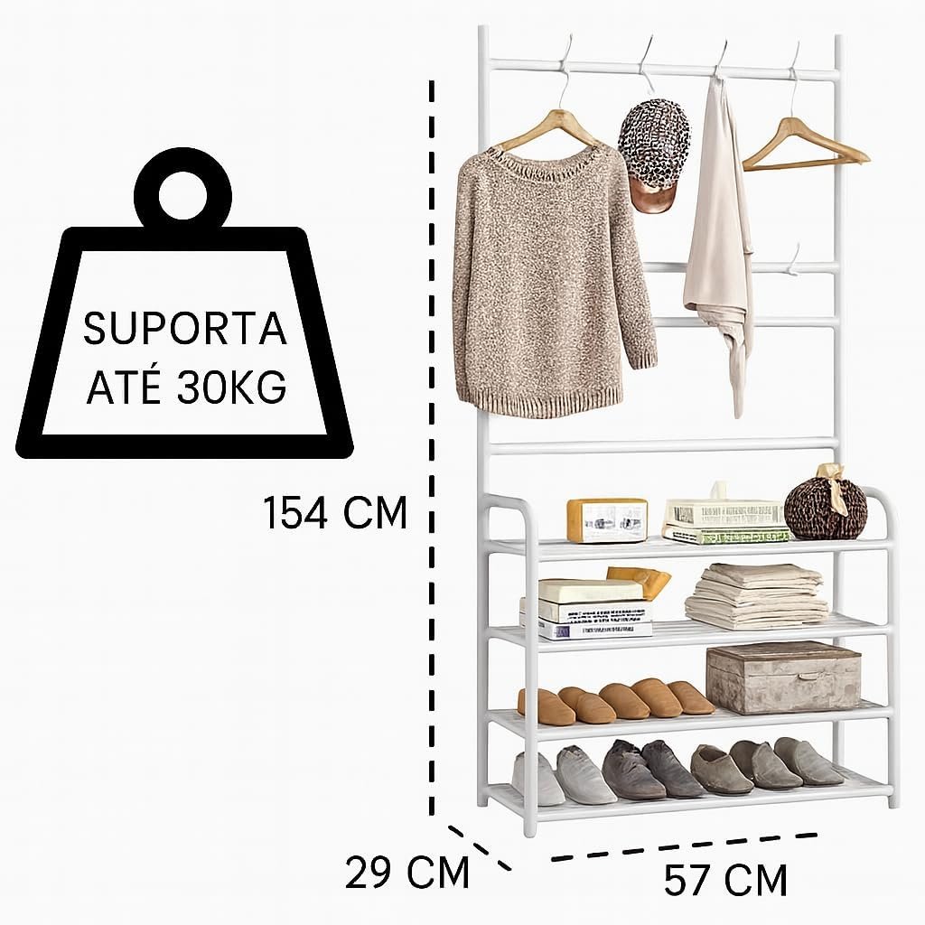 Sapateira Organizador com Cabideiro de Chão e 4 Prateleiras | Arara Multiuso Vertical para Roupas, Bolsas e Sapatos (Preto)