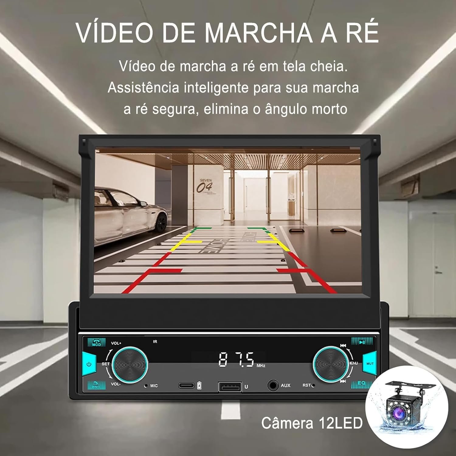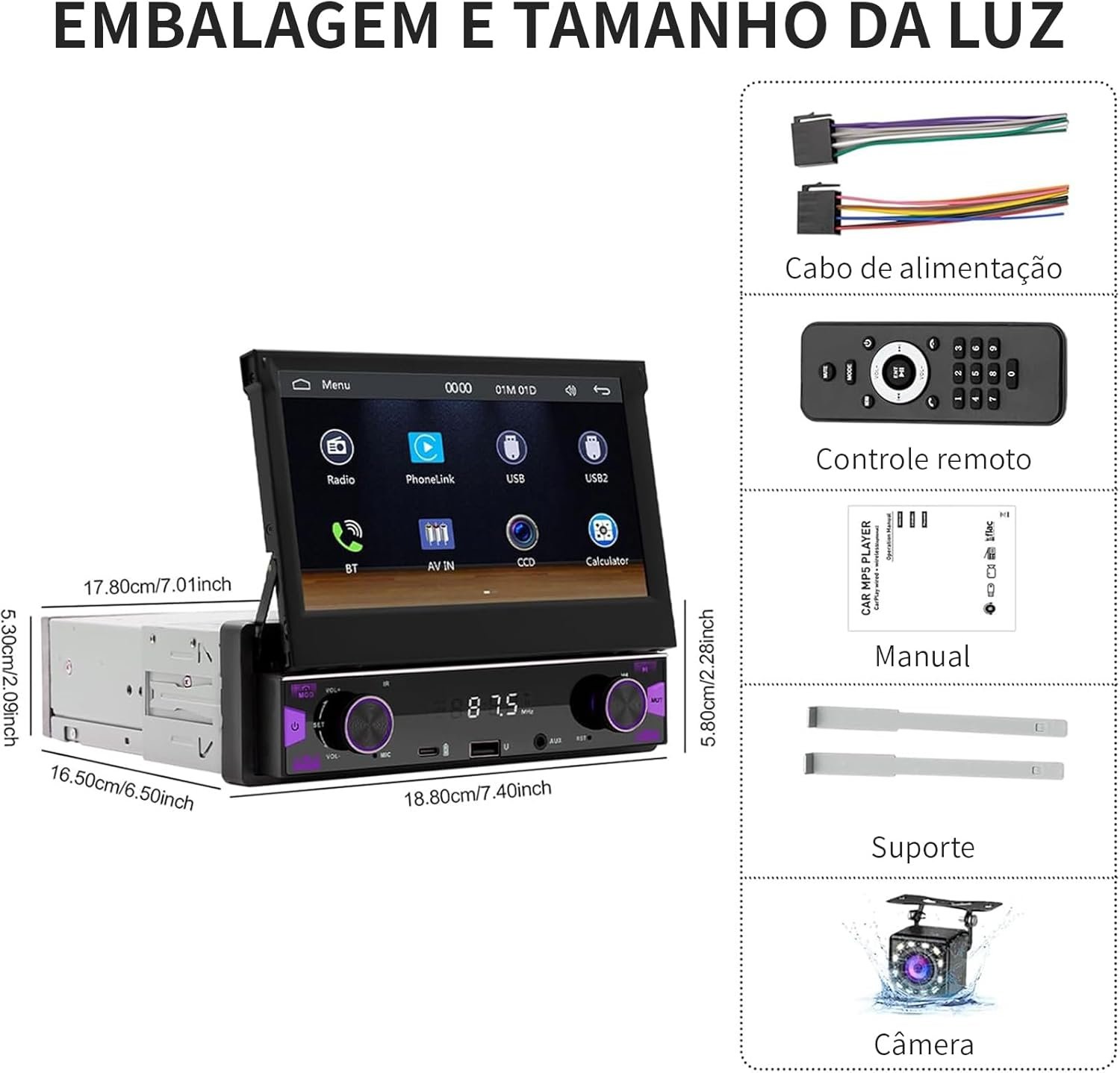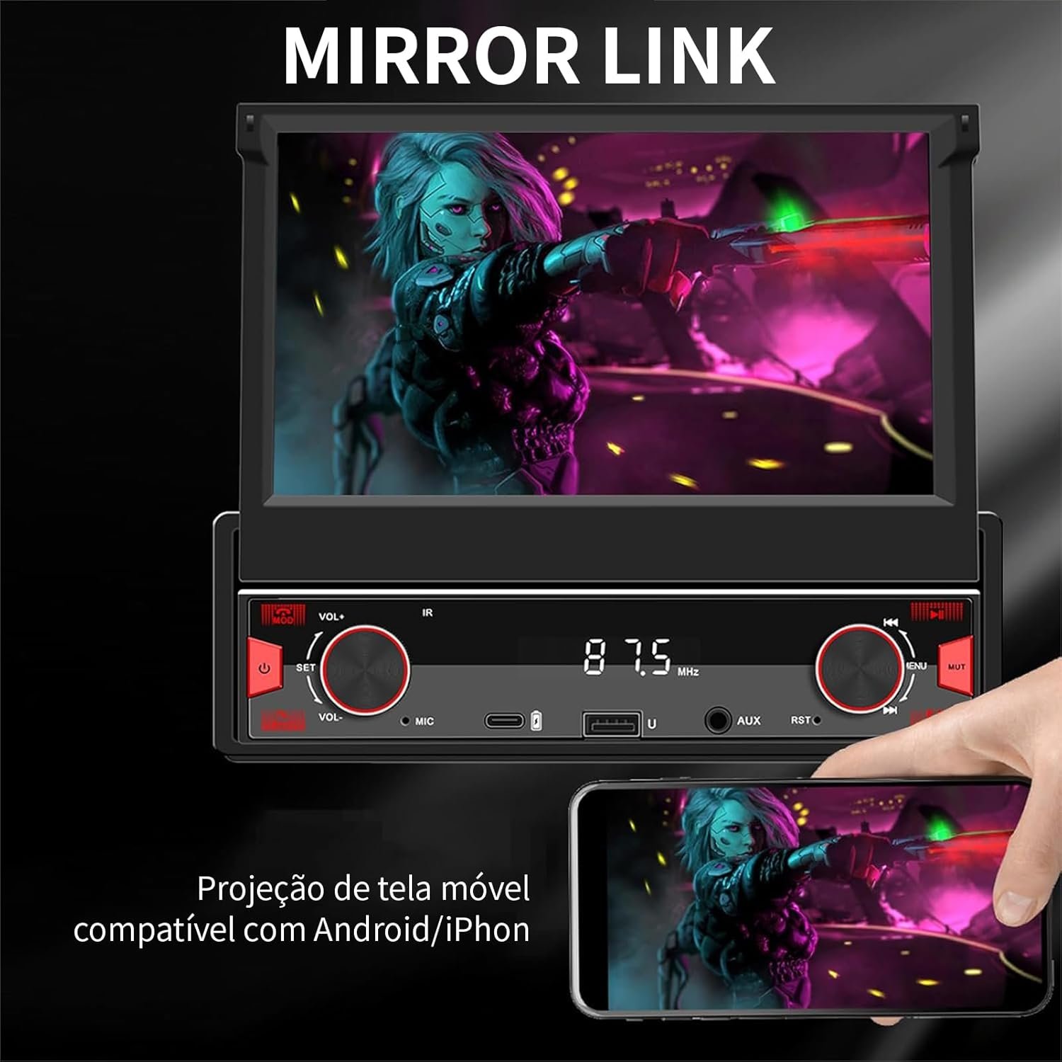 Sistema Estéreo Automotivo Retrátil, multimidia 7 polegadas, CarPlay e Android Auto, Câmera de Ré e Controle no Volante – Ideal para Segurança Familiar e Entretenimento no Carro