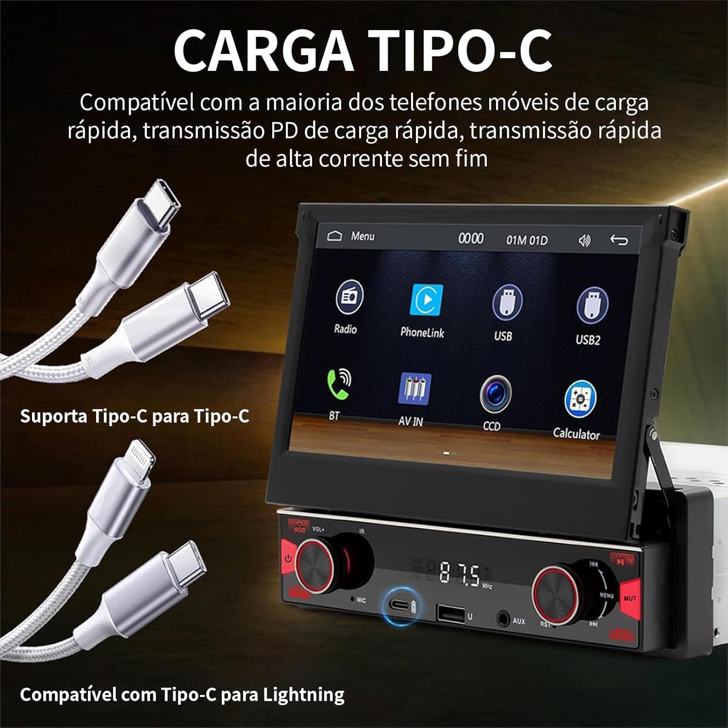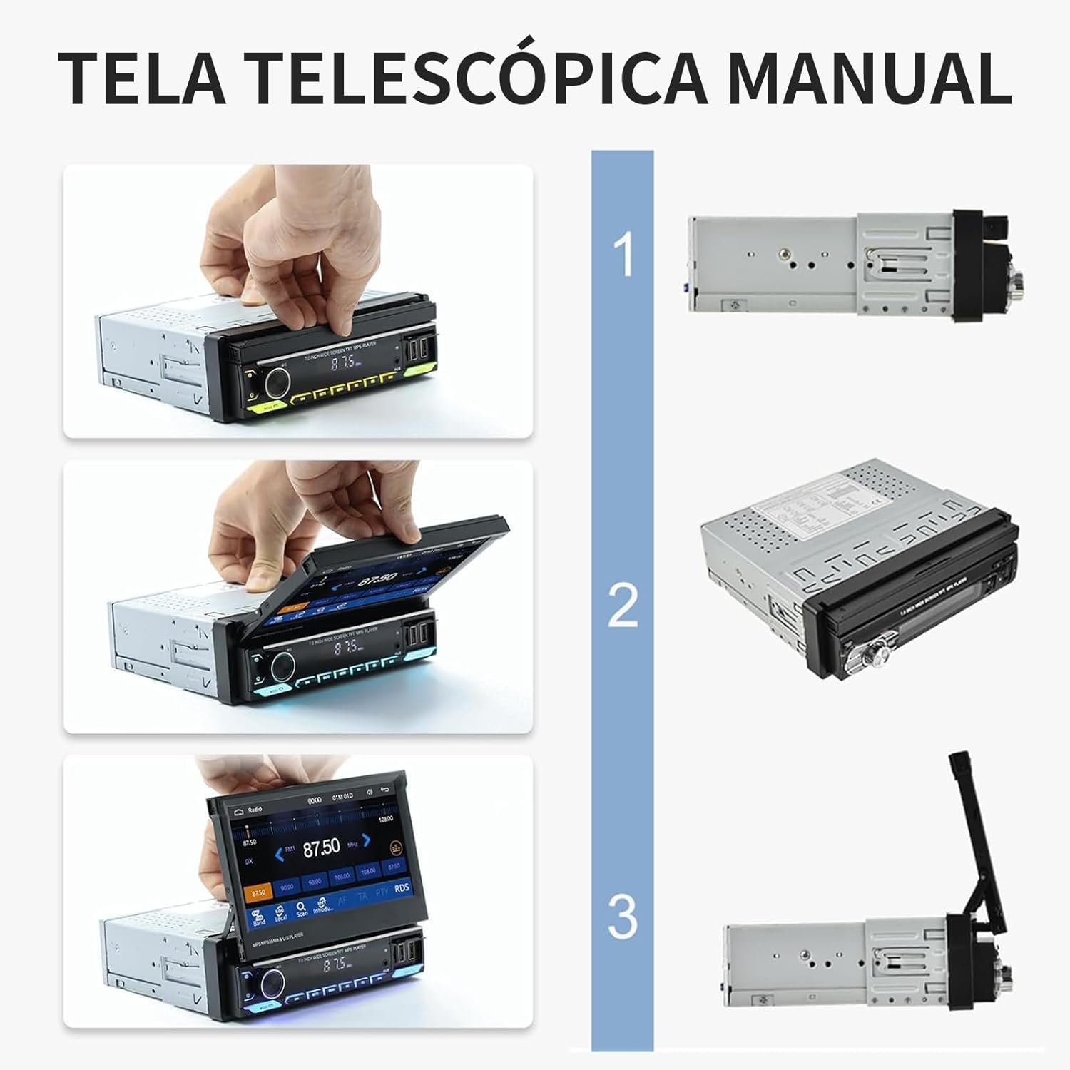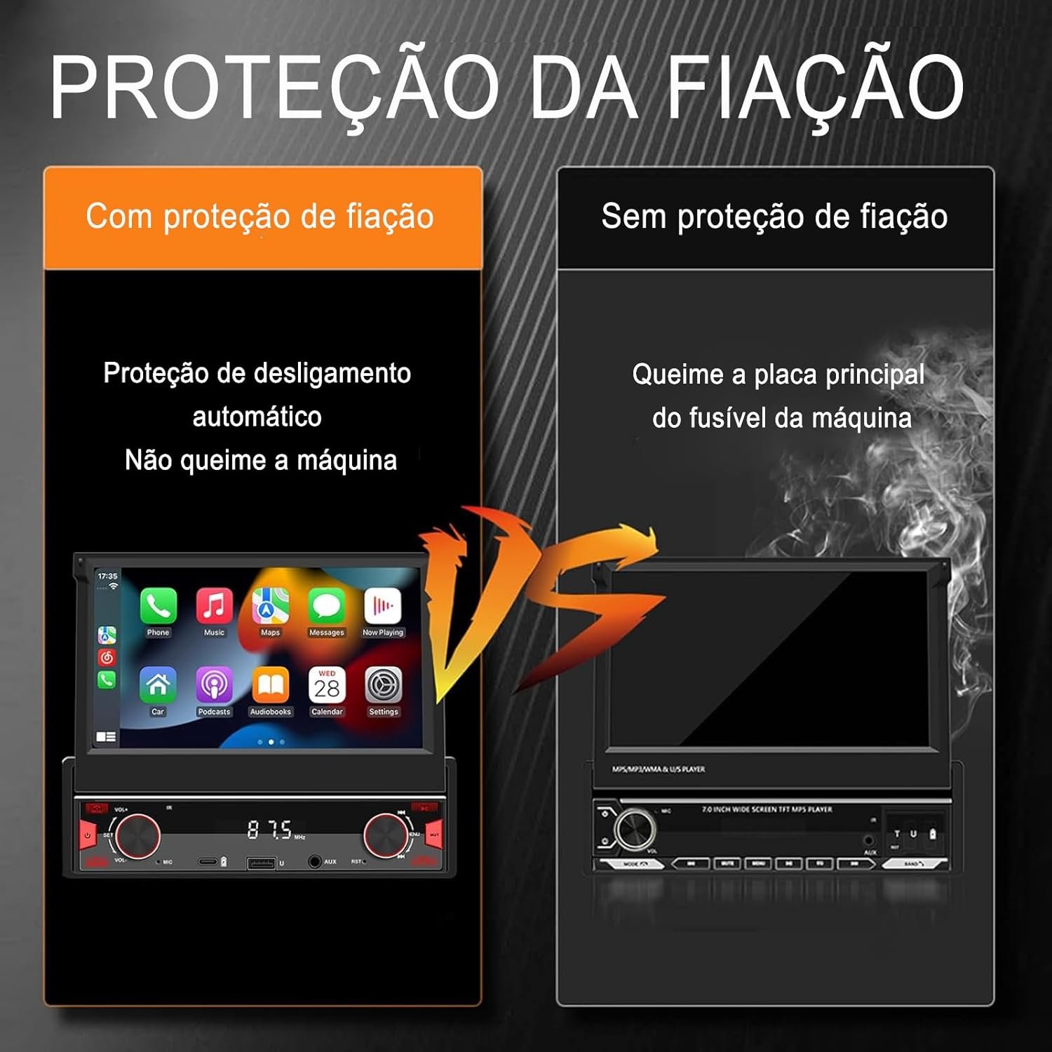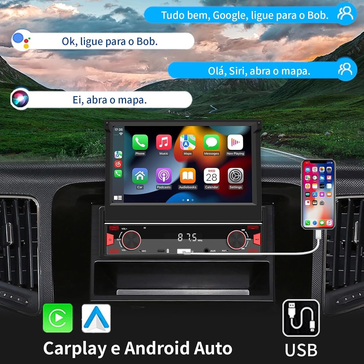 Sistema Estéreo Automotivo Retrátil, multimidia 7 polegadas, CarPlay e Android Auto, Câmera de Ré e Controle no Volante – Ideal para Segurança Familiar e Entretenimento no Carro