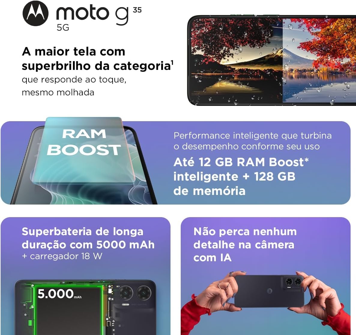 Título do Produto: Smartphone Motorola Moto g35 5G – 128GB 12GB (4GB RAM+8GB Ram Boost) e Câmera 50MP com AI NFC Tela 6.7″ com Superbrilho – Grafite