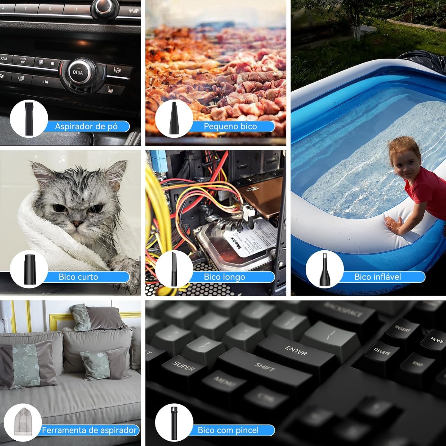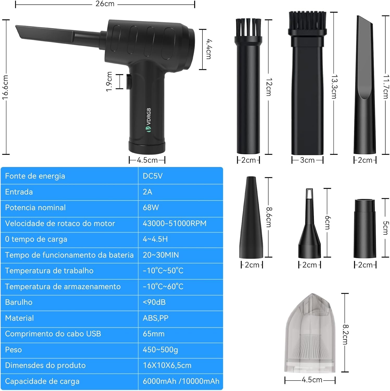 Soprador de Ar para PC, Aspirador de Pó Sem Fio Portátil Limpeza de Carro Escritório Automotiva Multifuncional Bateria Alta Capacidade Motor 6000mha Recarregável USB Vacuum Cleaner (kit 1)