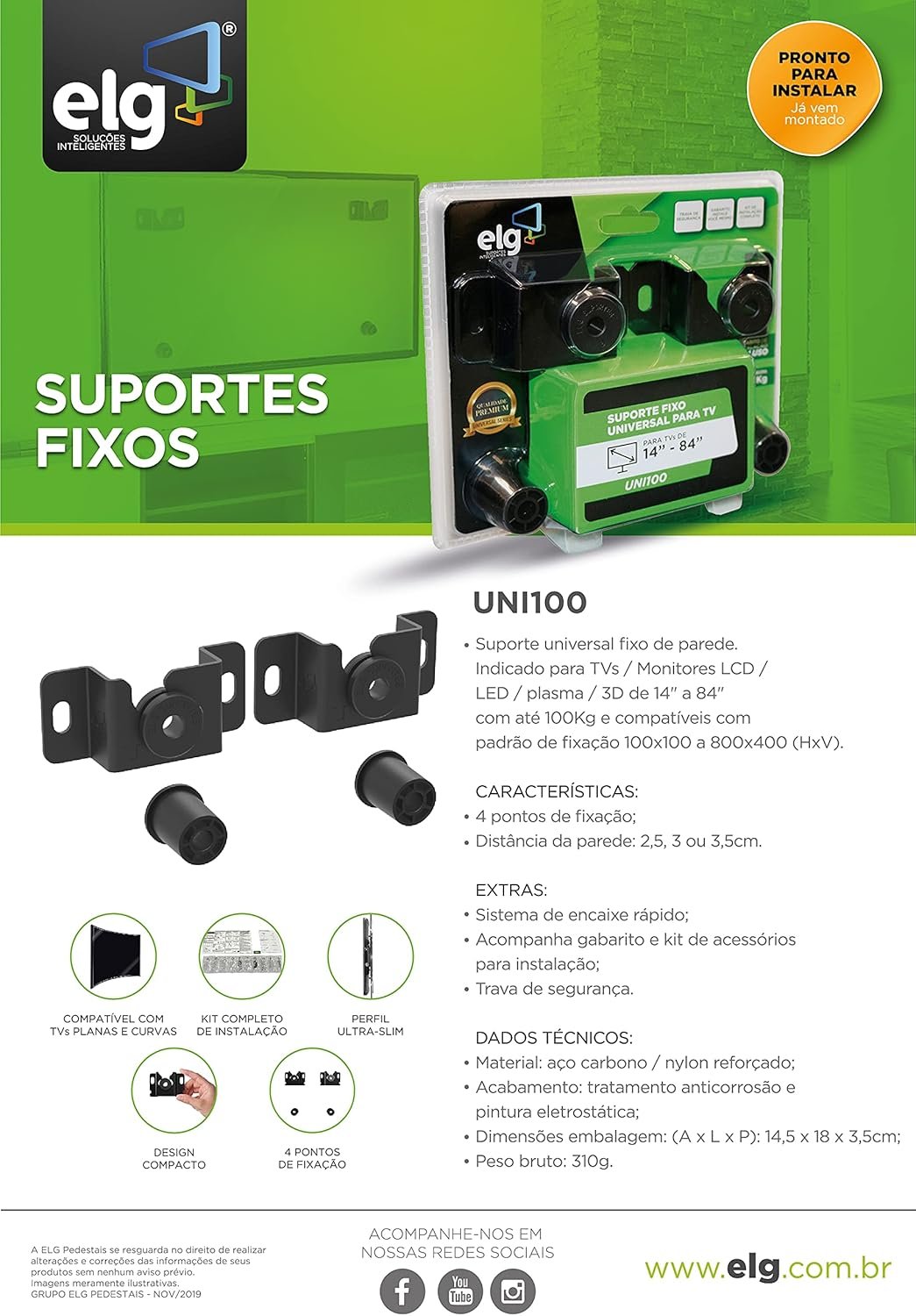 Transforme sua experiência de assistir TV com o Suporte Fixo Universal de Parede UNI100 da ELG. Com capacidade para até 100 kg e compatibilidade com TVs de 14″ a 100″, este suporte é ideal para qualquer ambiente. Seu design preto elegante se adapta perfeitamente a qualquer decoração, enquanto o padrão VESA de 75×75 a 800x400mm garante fácil instalação em qualquer modelo de TV. Aproveite ao máximo seu entretenimento com praticidade e segurança, graças ao Suporte Fixo Universal de Parede UNI100.