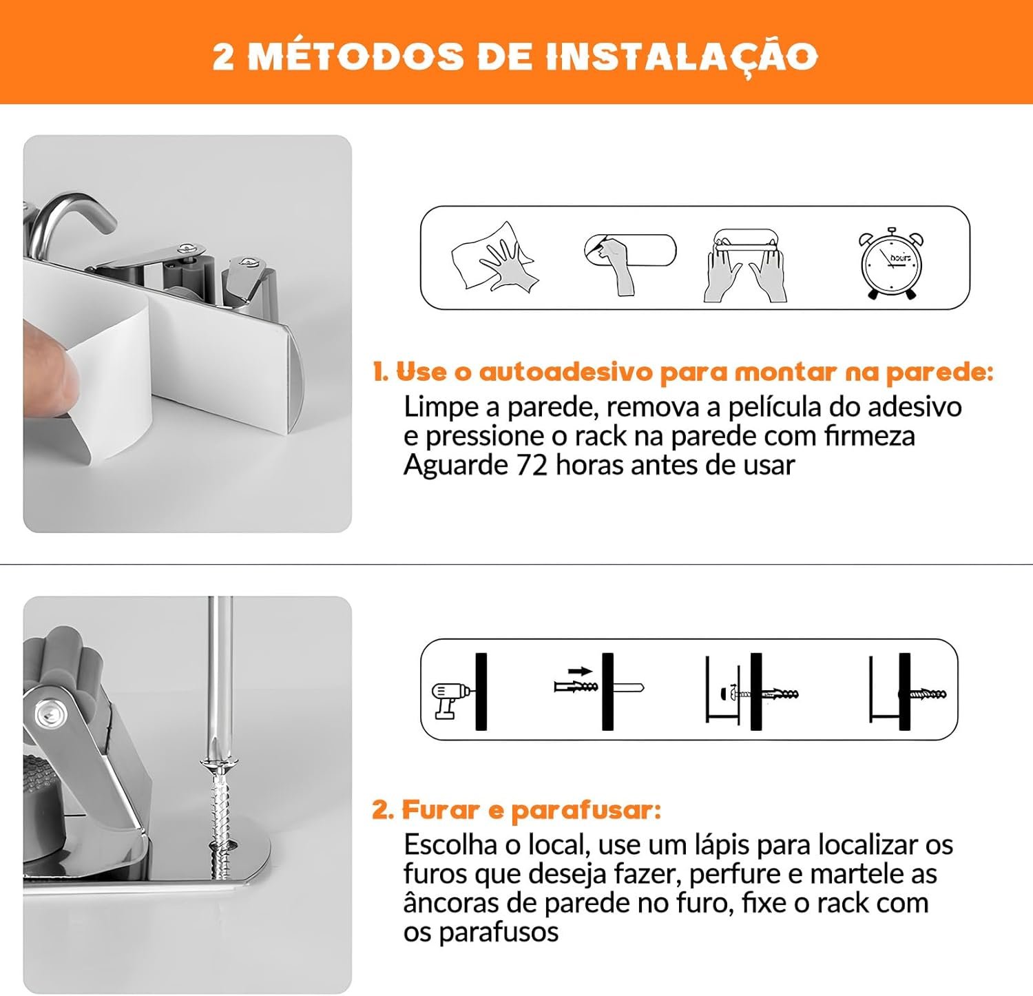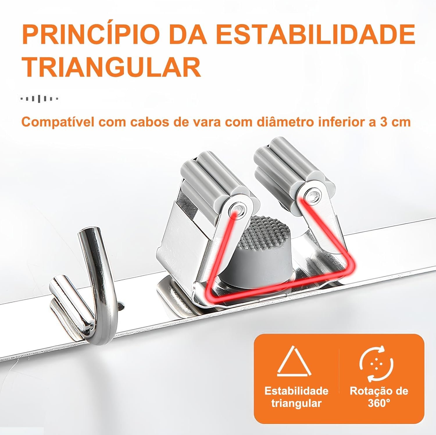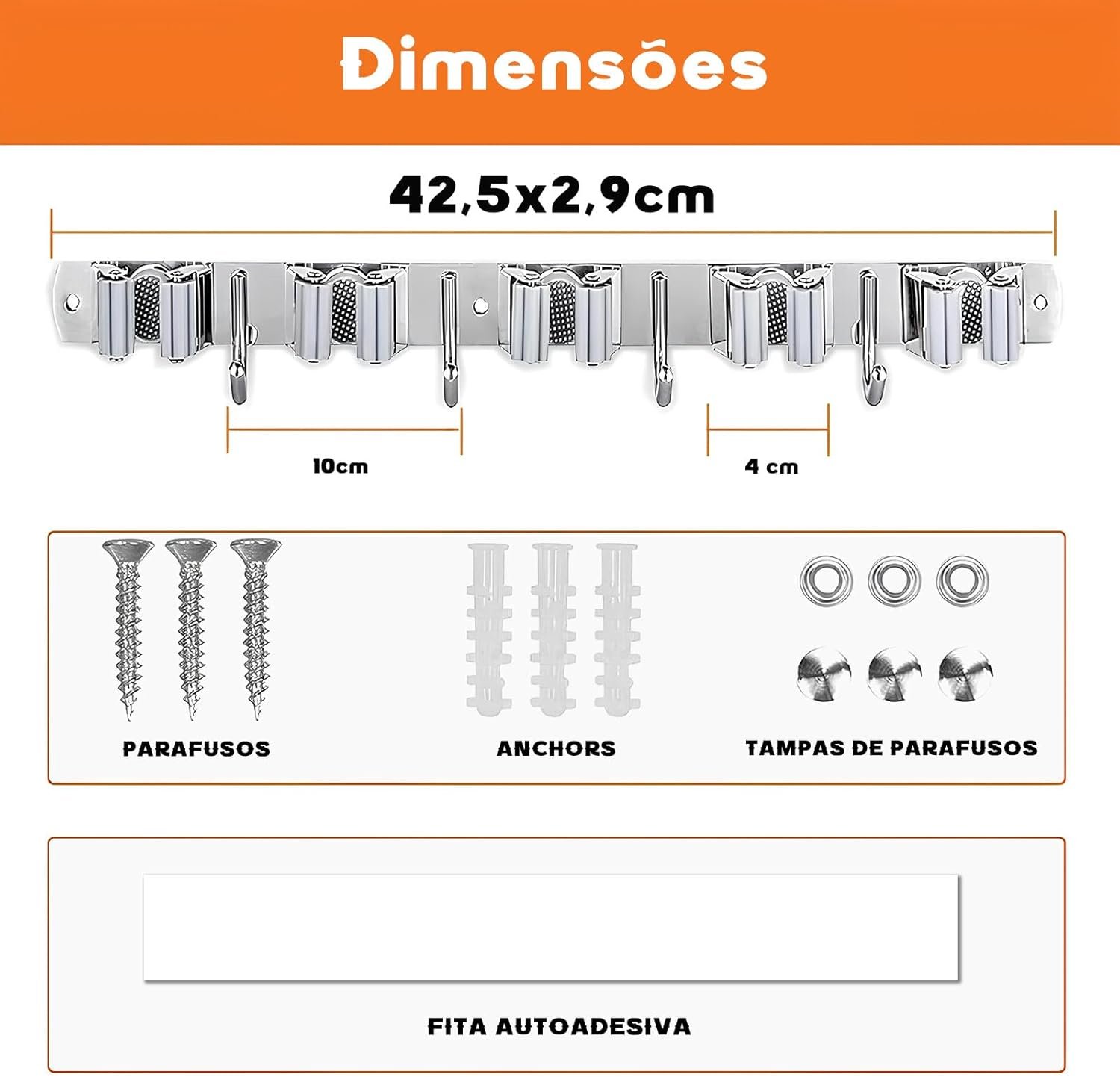 Suporte para Vassouras e Rodo de Parede com 9 Acessórios – Porta Vassoura de Parede em Aço Inoxidável Prático para Cozinha e Lavanderia