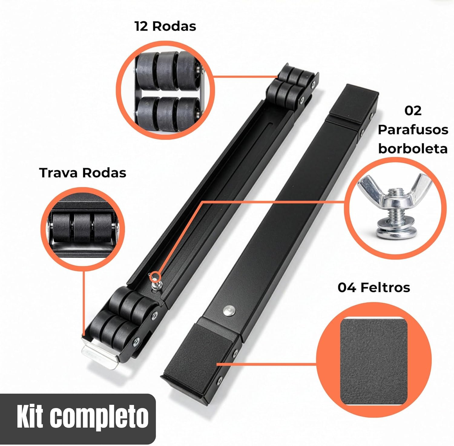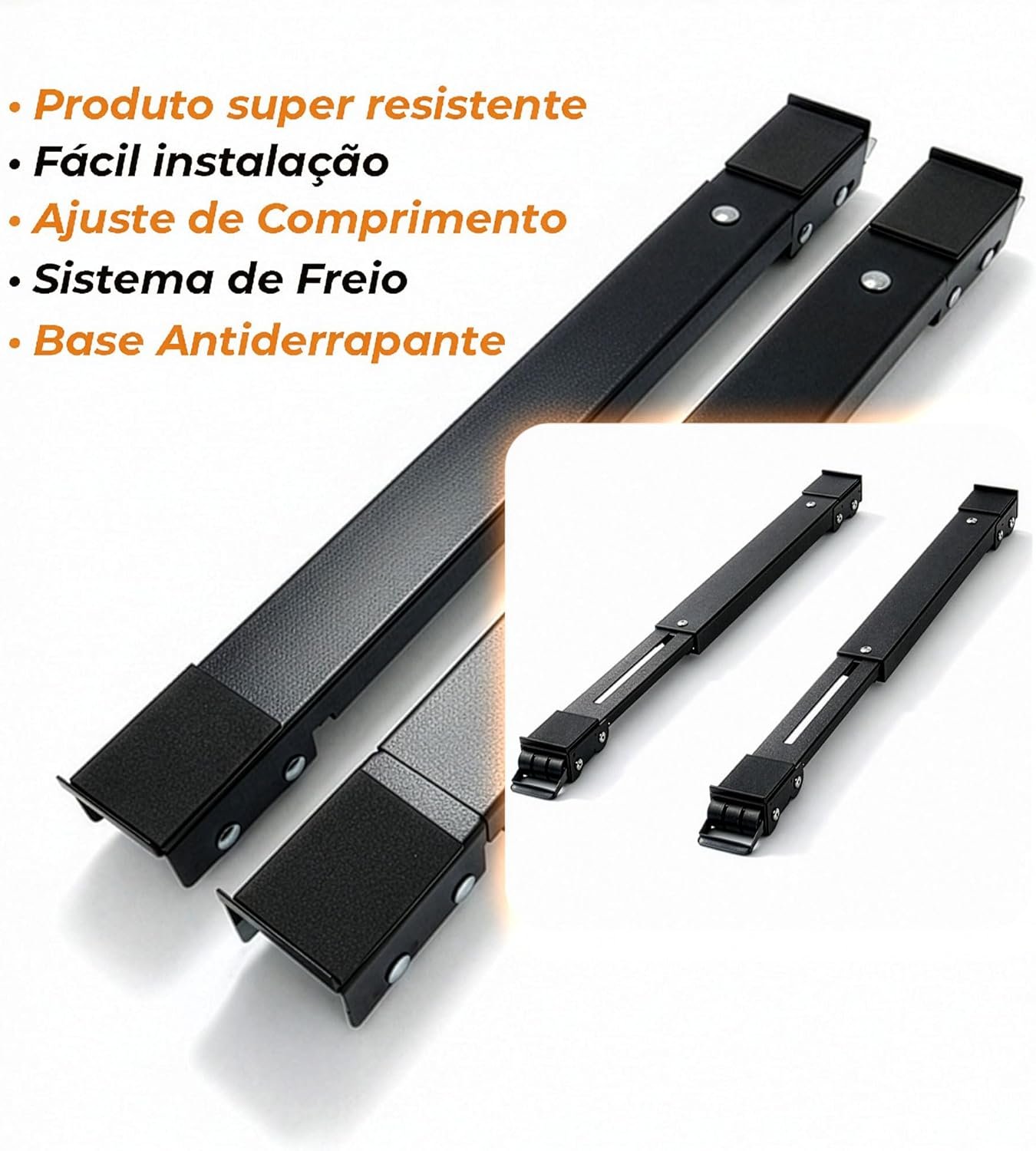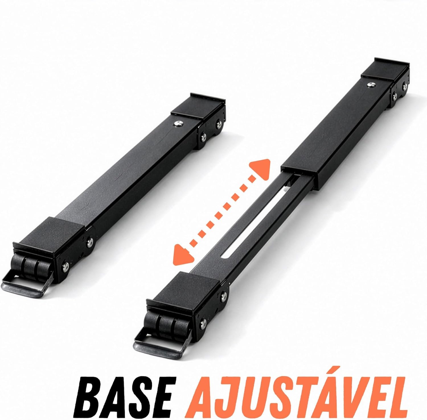 Suporte Universal Ajustável com Rodinhas e Trava Dupla para Geladeira, Fogão e Máquina de Lavar – Base Elevatória em Aço com Rodízios Reforçados e Pés Antivibração – Kit 2 Barras Preto