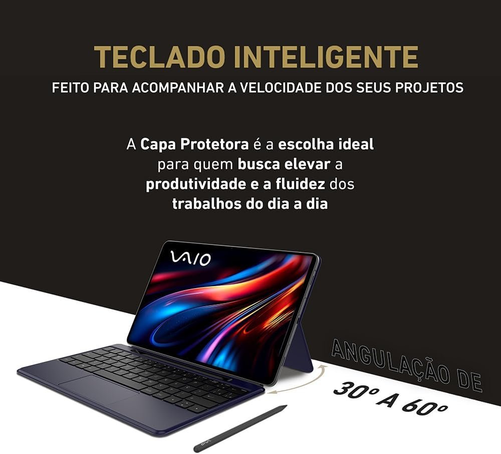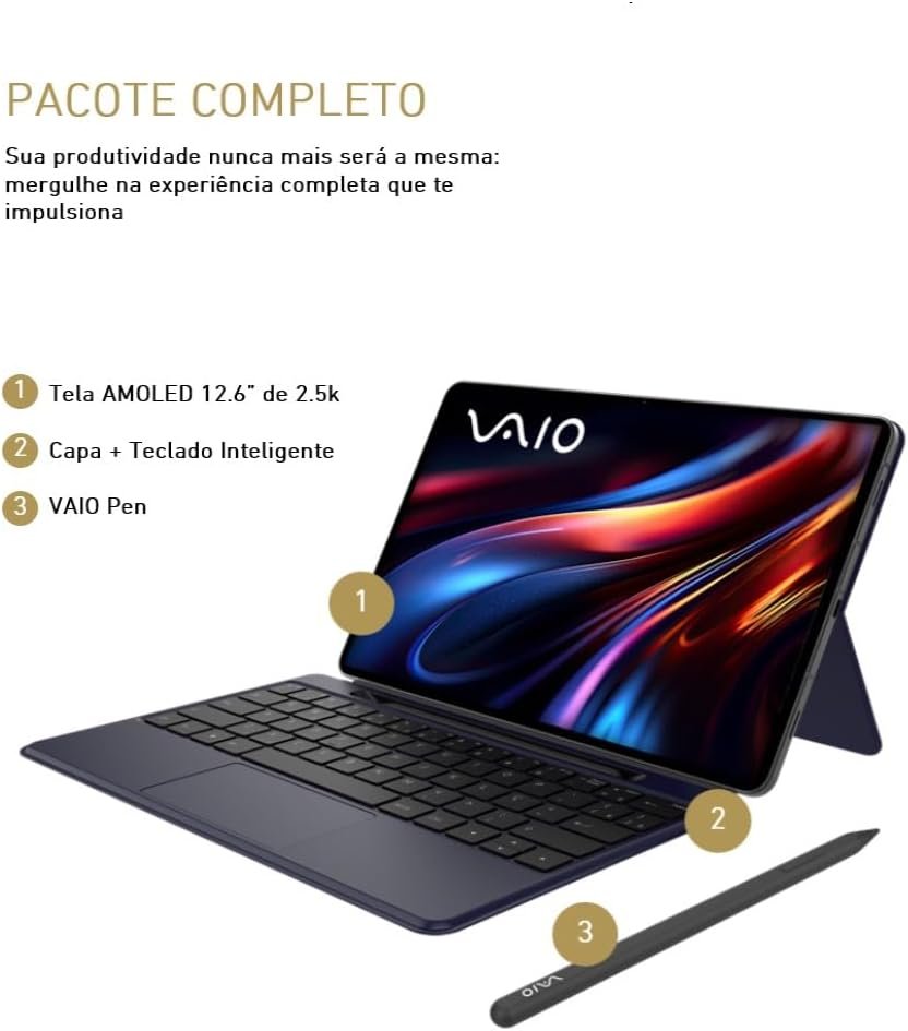 Título do Produto: Tablet VAIO TL12 12GB 512GB Octa-Core UNISOC T820, Tela AMOLED 12.6” 2.5k, com Teclado Inteligente, Capa Protetora e Caneta VAIO PEN, 5G WiFi, 10.090 mAh, Android 15, Câmera 13MP + Selfie 12MP – Preto