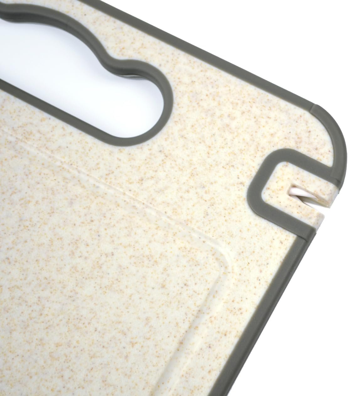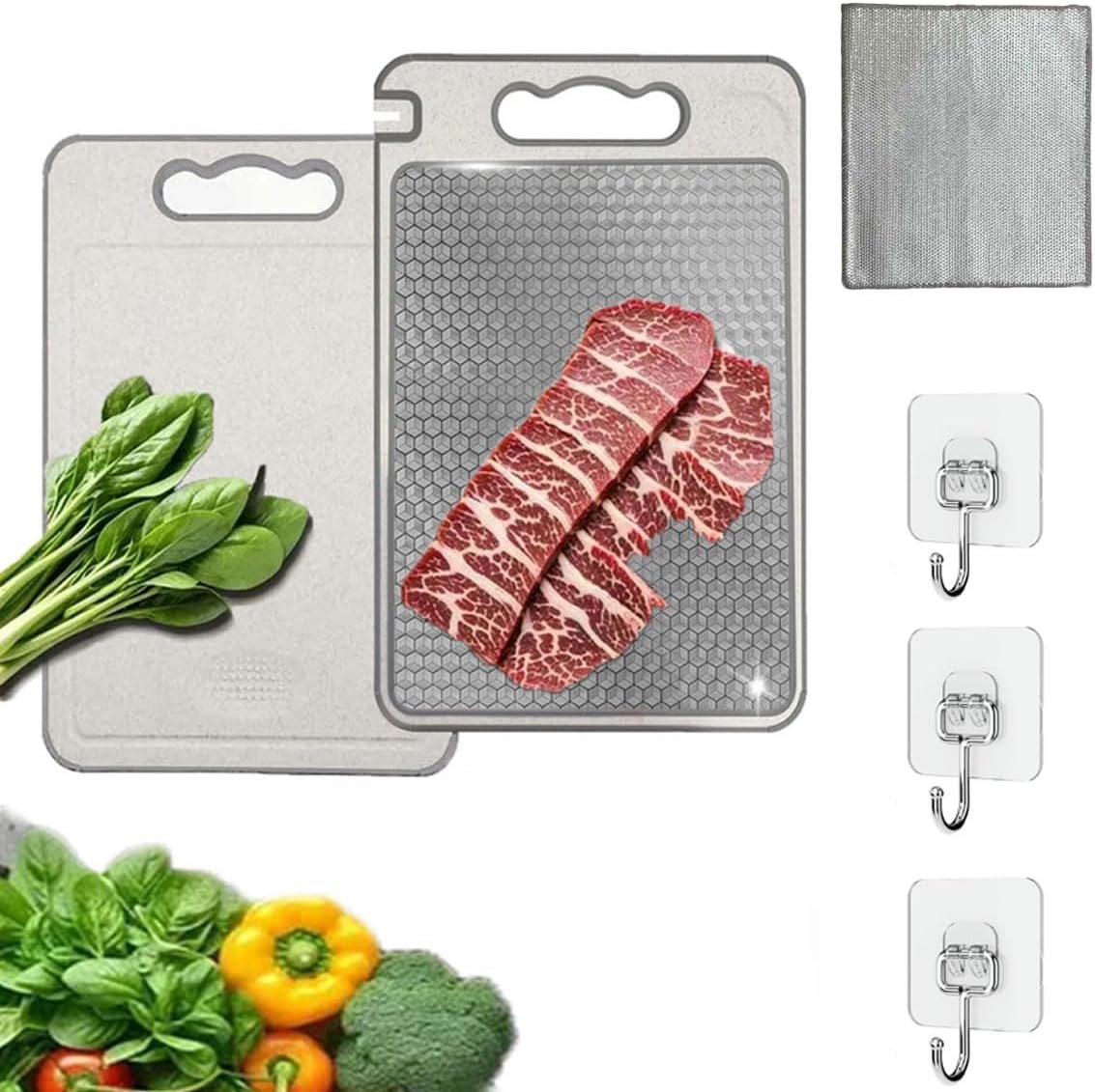 Tábua de corte de dupla face de aço inoxidável 304 e palha de trigo, manuseia carne e legumes separadamente, pode ser lavada na máquina de lavar louça, Inclui Três Ganchos e Um Pano
