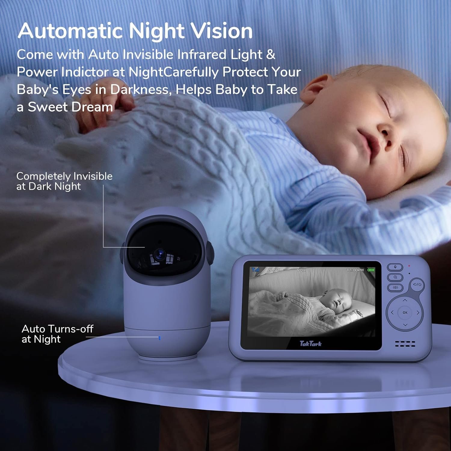 TakTark Babá Eletrônica Câmera, 4.3″ Monitores de Câmara de Vídeo, Pan & Tilt, 2 Way Audio, Visão Nocturna, Zoom Digital, Decoração Sonora VOX, Ideal para Novos Pais