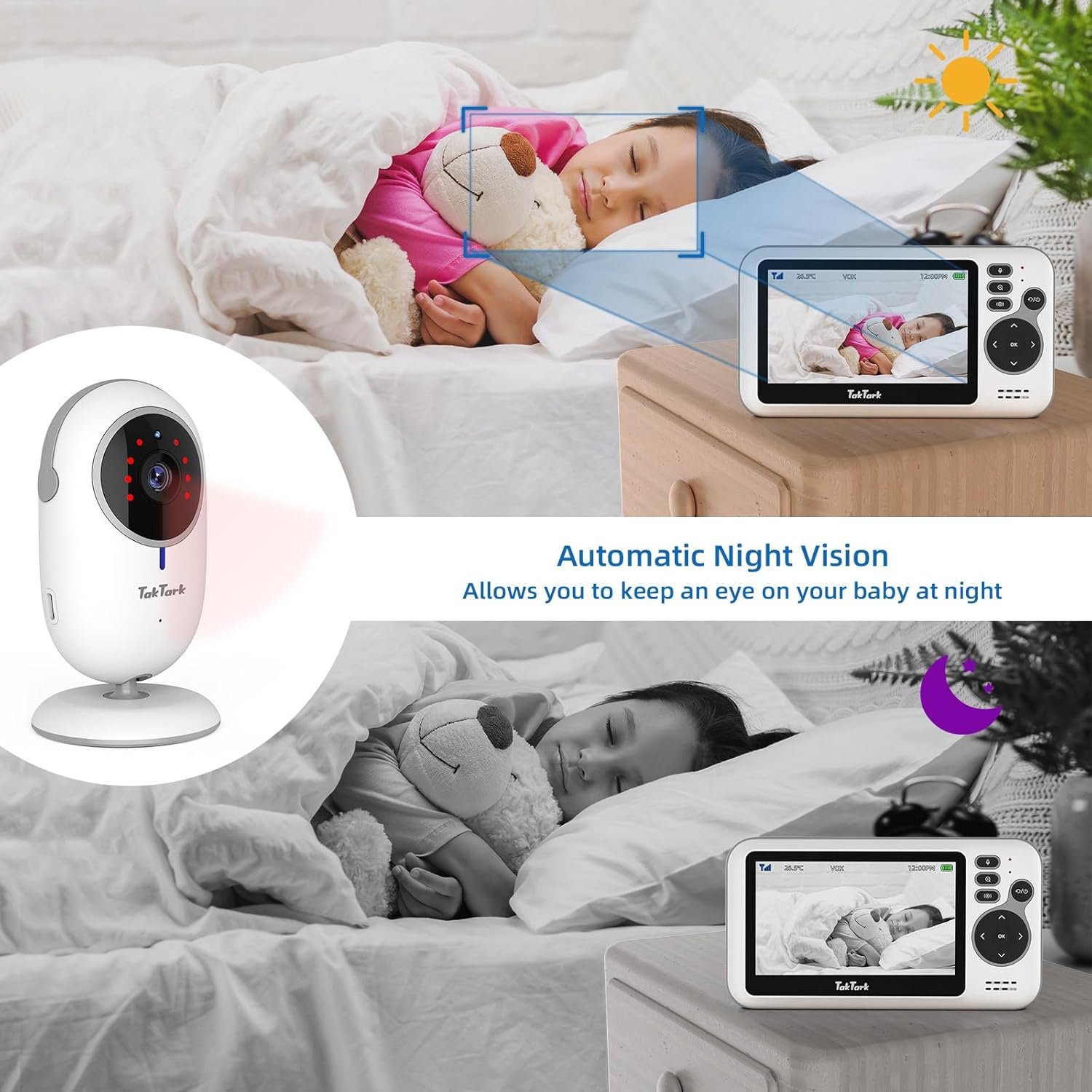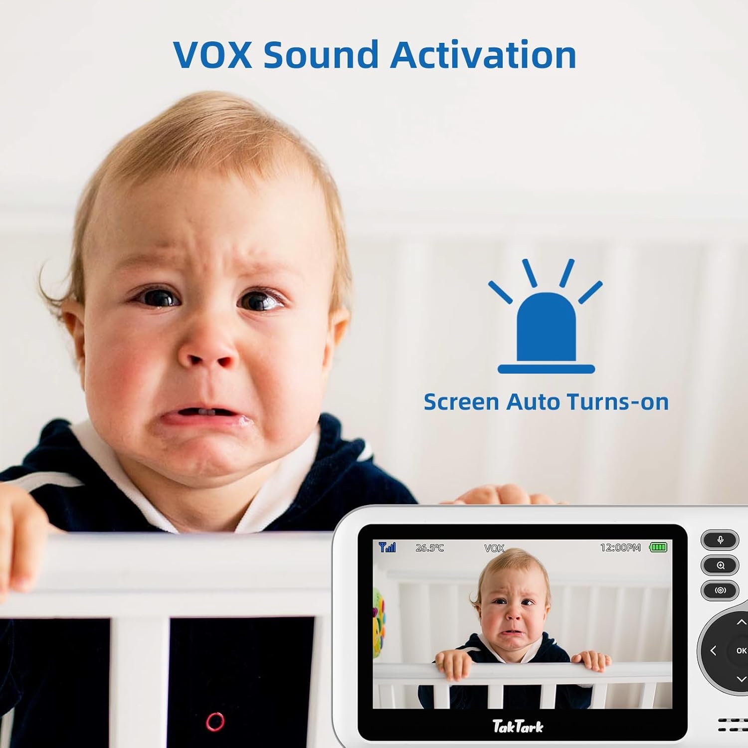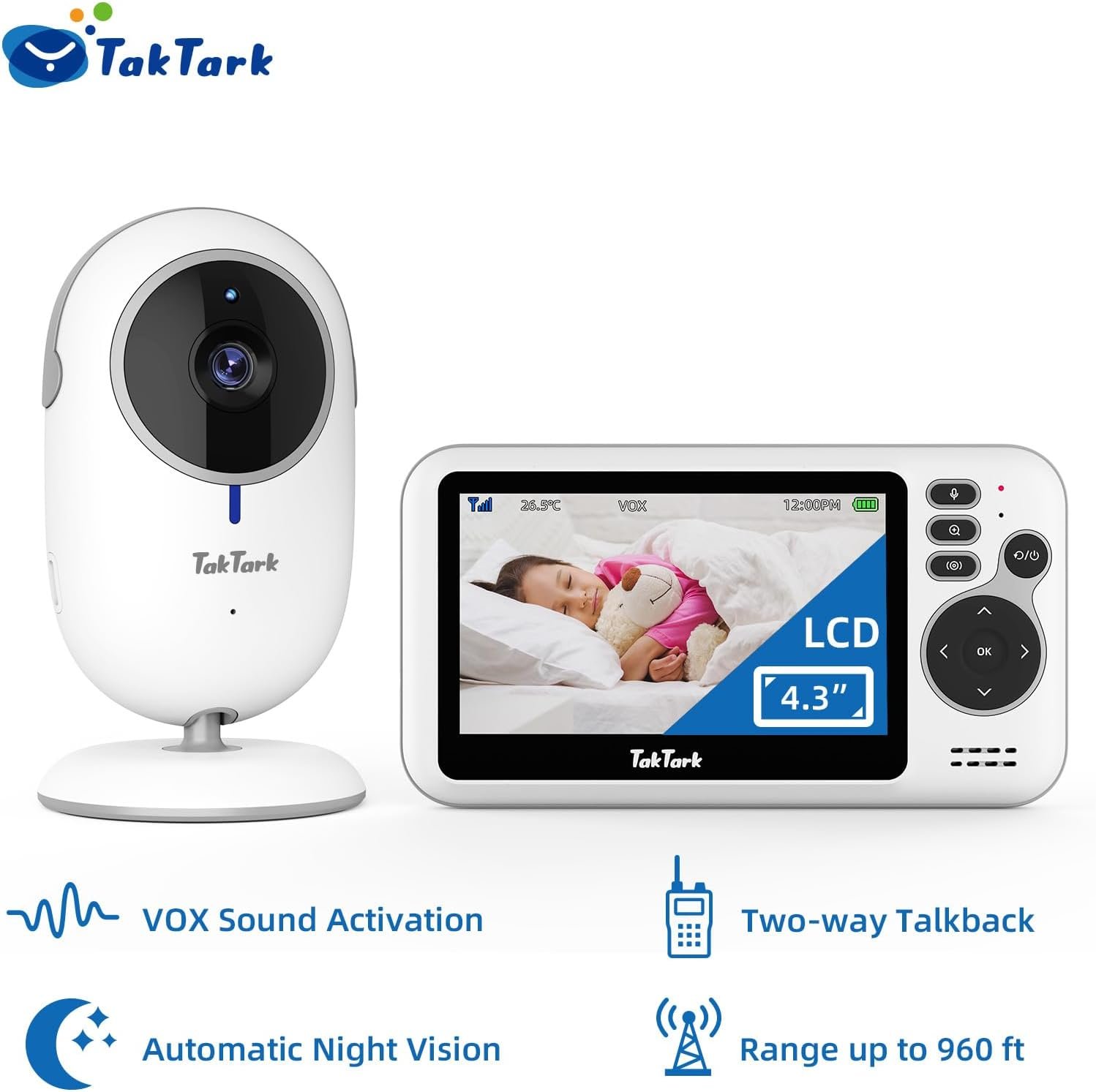 TakTark Babá Eletrônica com Câmera de Bebê 4.3″ Monitor, Sem Wi-Fi, Áudio Bidirecional, Visão Noturna, Zoom Digital 3X, Modo VOX, Monitoramento de Temperatura, Ideal para Pais Novos