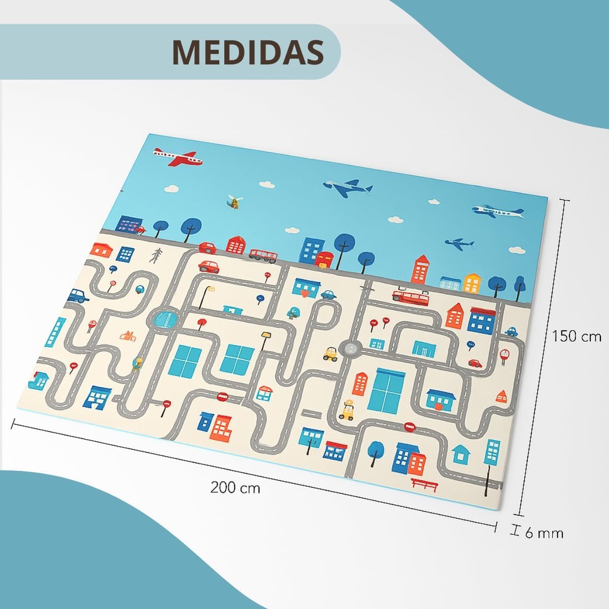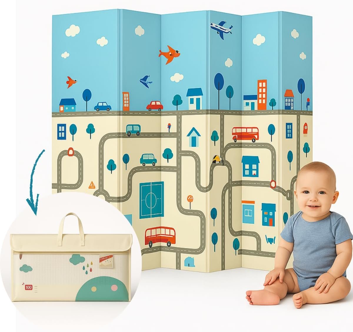 Tapete Infantil Emborrachado Dobrável 2×1,5m Tatame Dupla Face 6mm Antiderrapante Bebê Atividades Educativa Macio Impermeável Colorido Tapetinho Criança Reversível Leve com Bolsa (Safari e Cidade) (Cidade)