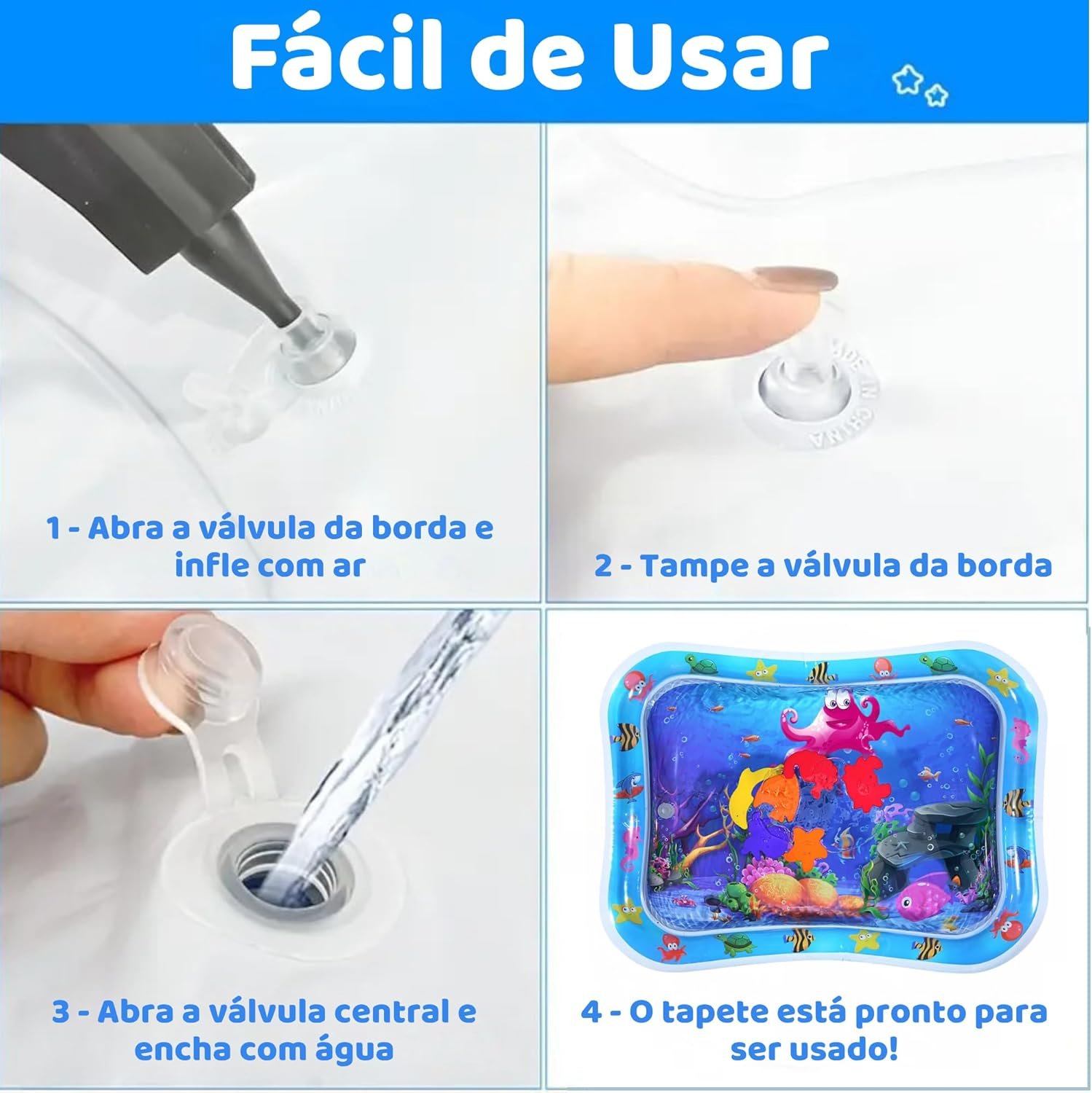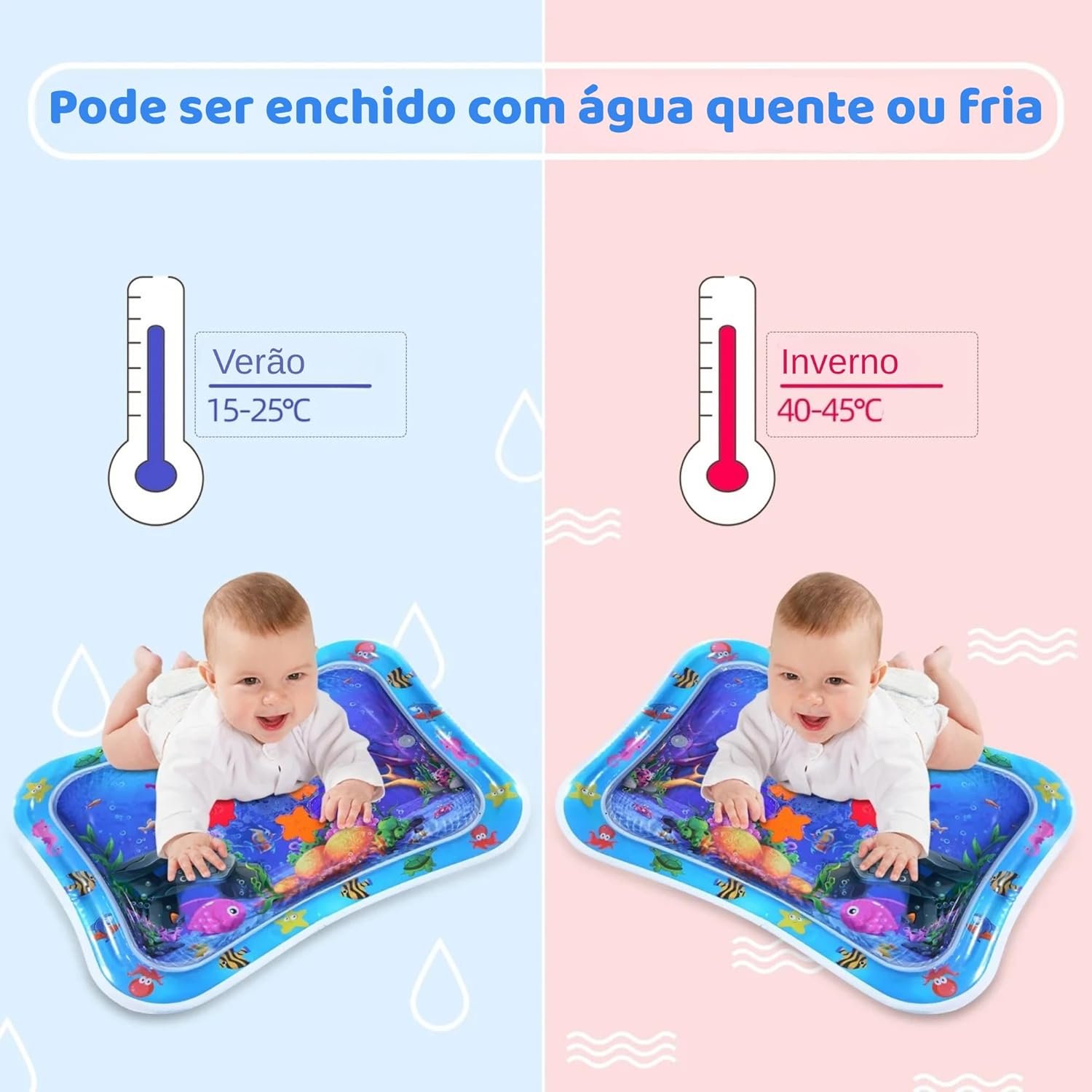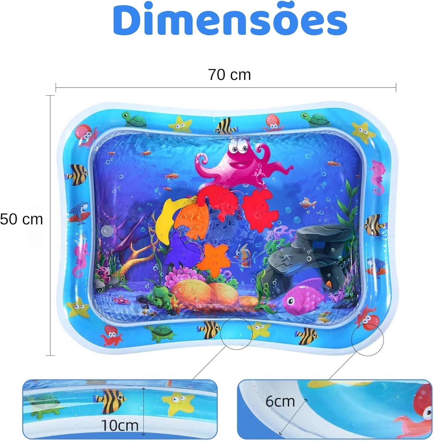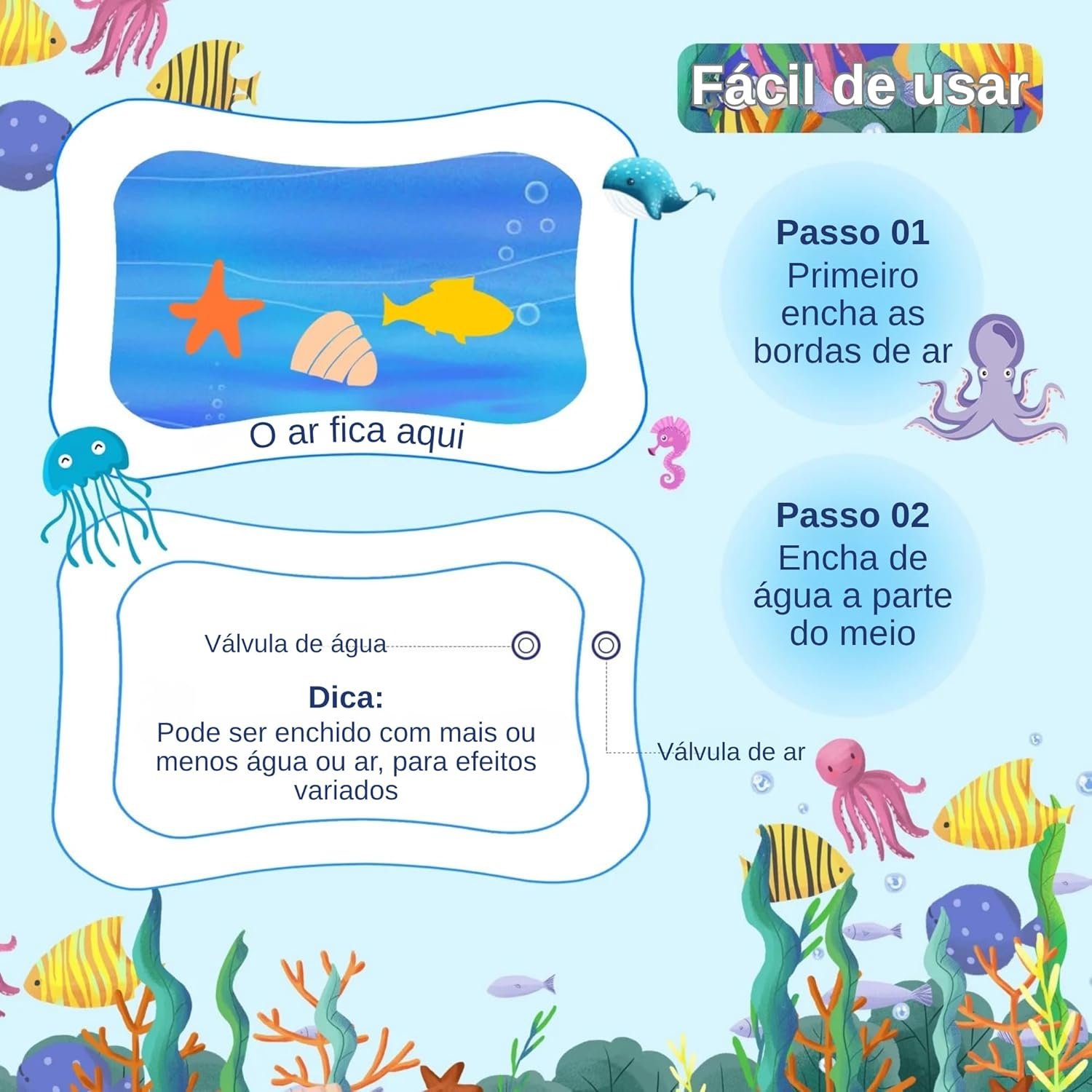 Descubra a magia do Tapete Inflável Sensorial para Bebê! Estimule os sentidos do seu pequeno com água morna ou fria, peixinhos flutuantes e bordas de ar. Com dimensões de 50×70 cm, este tapete promove diversão, coordenação e desenvolvimento motor. Proporcione momentos únicos de aprendizado e diversão para o seu bebê!