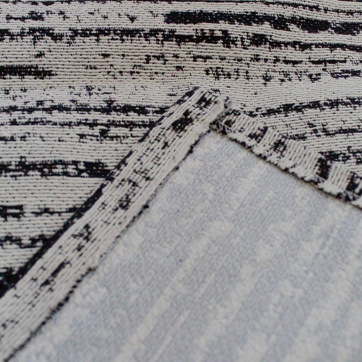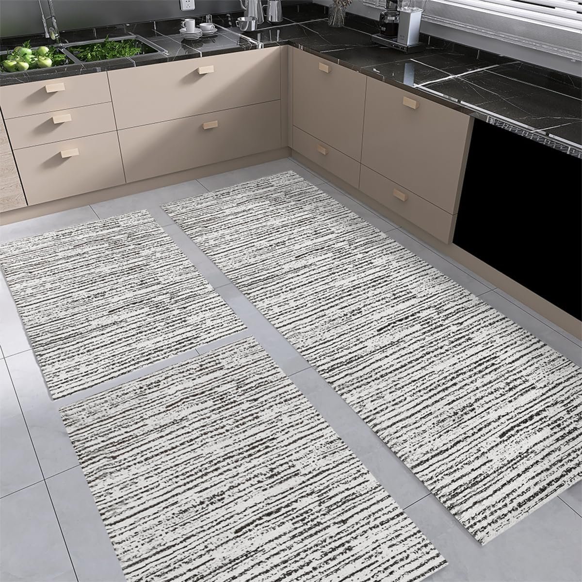 Tapete Kit de Cozinha Antiderrapante 3 Peças Mesclado Geométrico Conjunto Passadeira 1,30m x 45cm Capacho 65cm x 45cm Jogo Artesanal Cru Caramelo Preto (Riscato Preto)