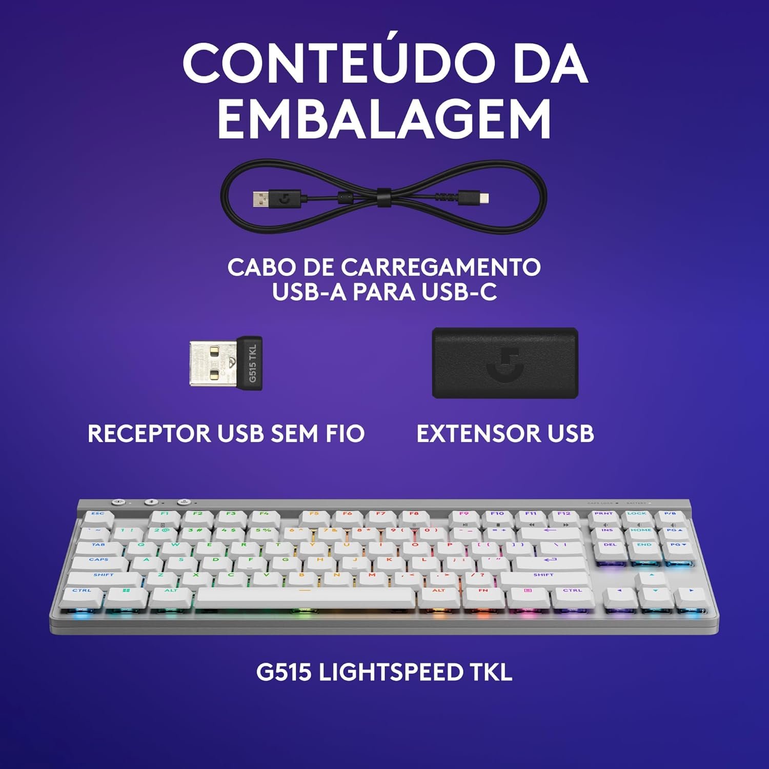 Teclado Mecânico Gamer Sem Fio Logitech G515 com Design TKL,Tecnologia LIGHTSPEED, RGB LIGHTSYNC, Conexão USB ou Bluetooth, Switch GL Brown Tactile e Bateria Recarregável – BrancoTeclado Mecânico Gamer Sem Fio Logitech G515 com Design TKL,Tecnologia LIGHTSPEED, RGB LIGHTSYNC, Conexão USB ou Bluetooth, Switch GL Brown Tactile e Bateria Recarregável – Branco