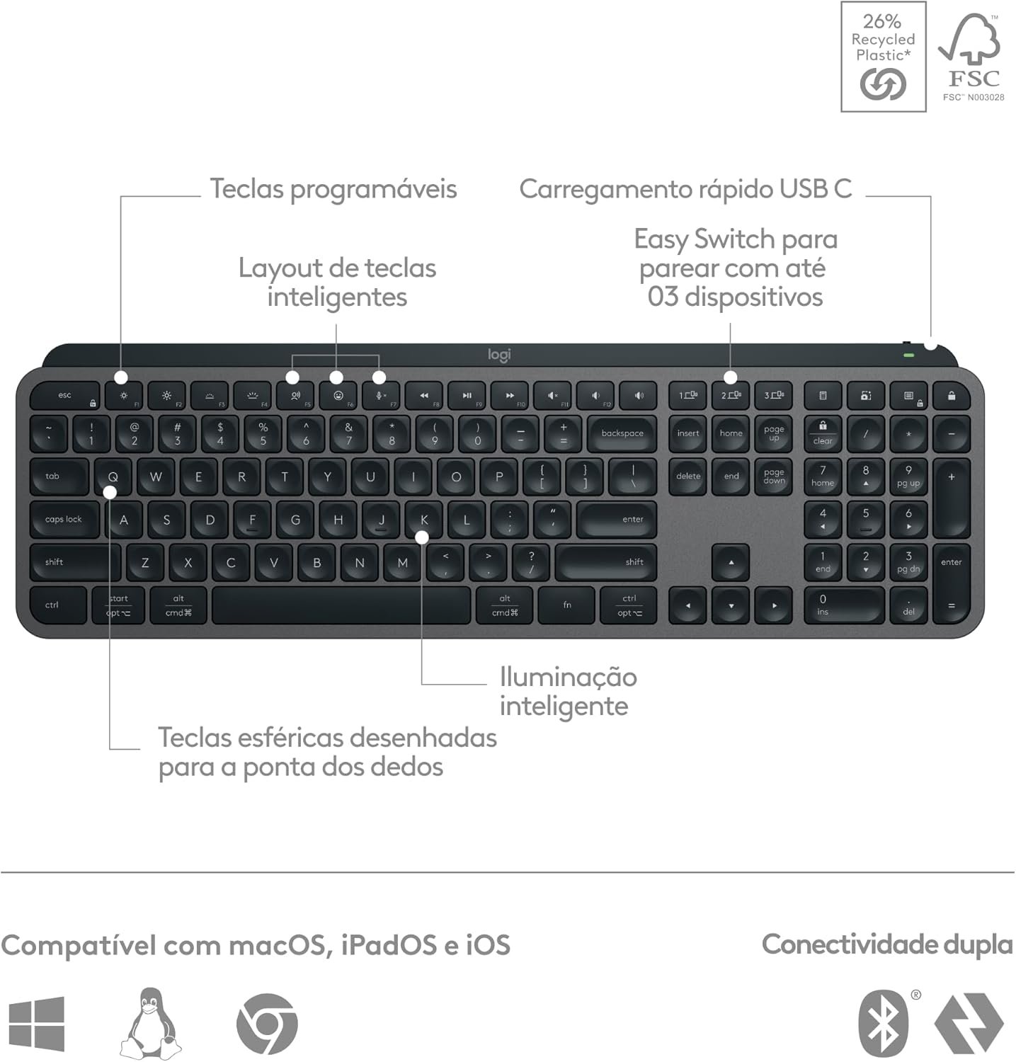 Teclado sem fio Logitech MX Keys S com Clique Silencioso, Teclas Programáveis, Iluminação Inteligente, Conexão Bluetooth ou Receptor USB Logi Bolt e Bateria Recarregável – Grafite