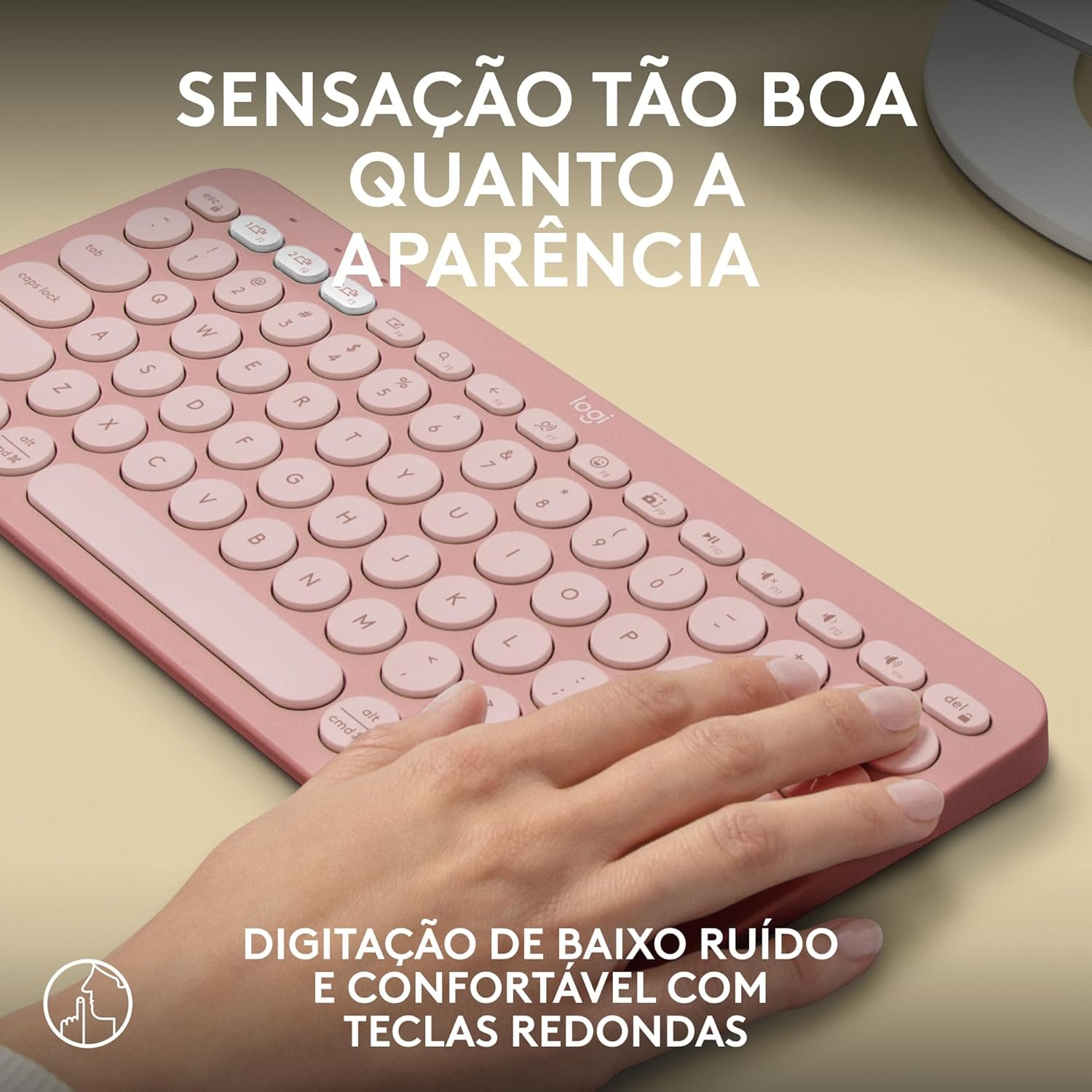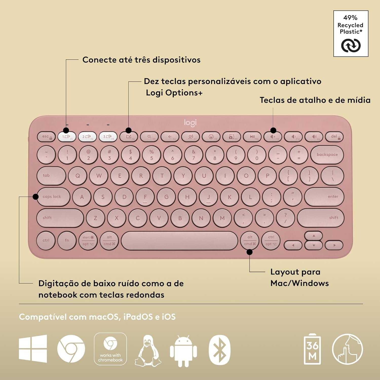 Teclado sem fio Logitech Pebble Keys 2 K380s com Conexão Bluetooth Easy-Switch e Pilha Inclusa – Compatível com PC, Mac, Chrome OS, Android, iOS e Apple TV, Layout US – Rosa