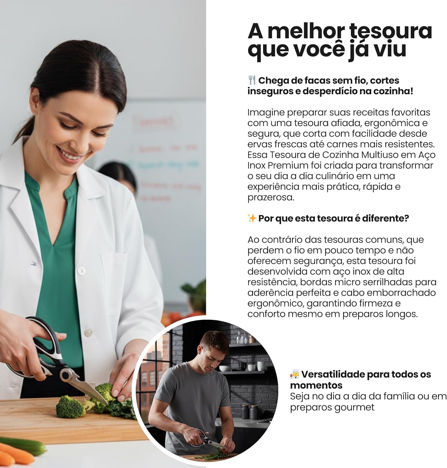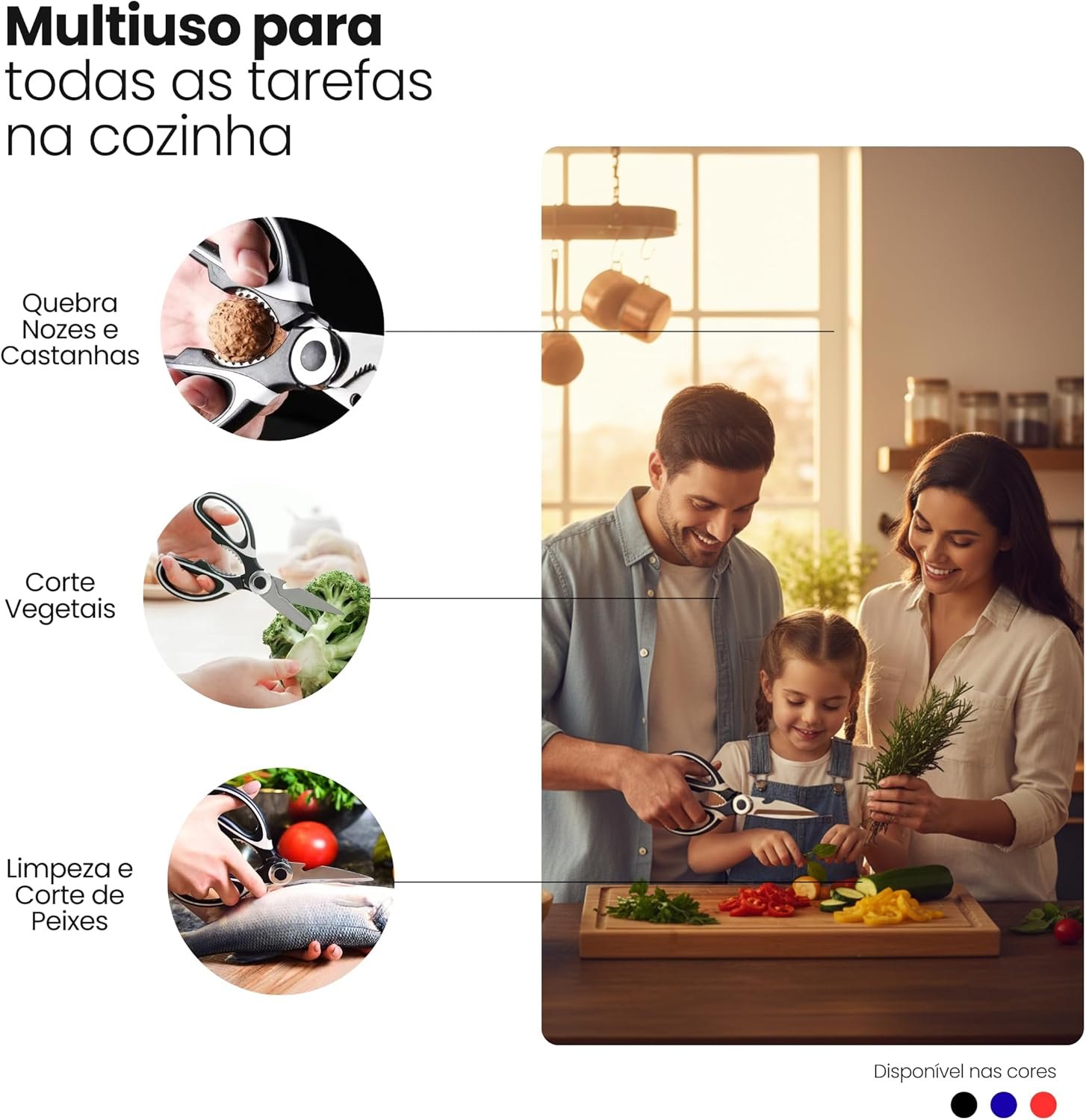Tesoura de Cozinha Multiuso Premium Inox com Bainha Protetora Cortes Precisos Carne Frango Peixe Ervas Legumes Frutas Uso Profissional e Doméstico 21 cm