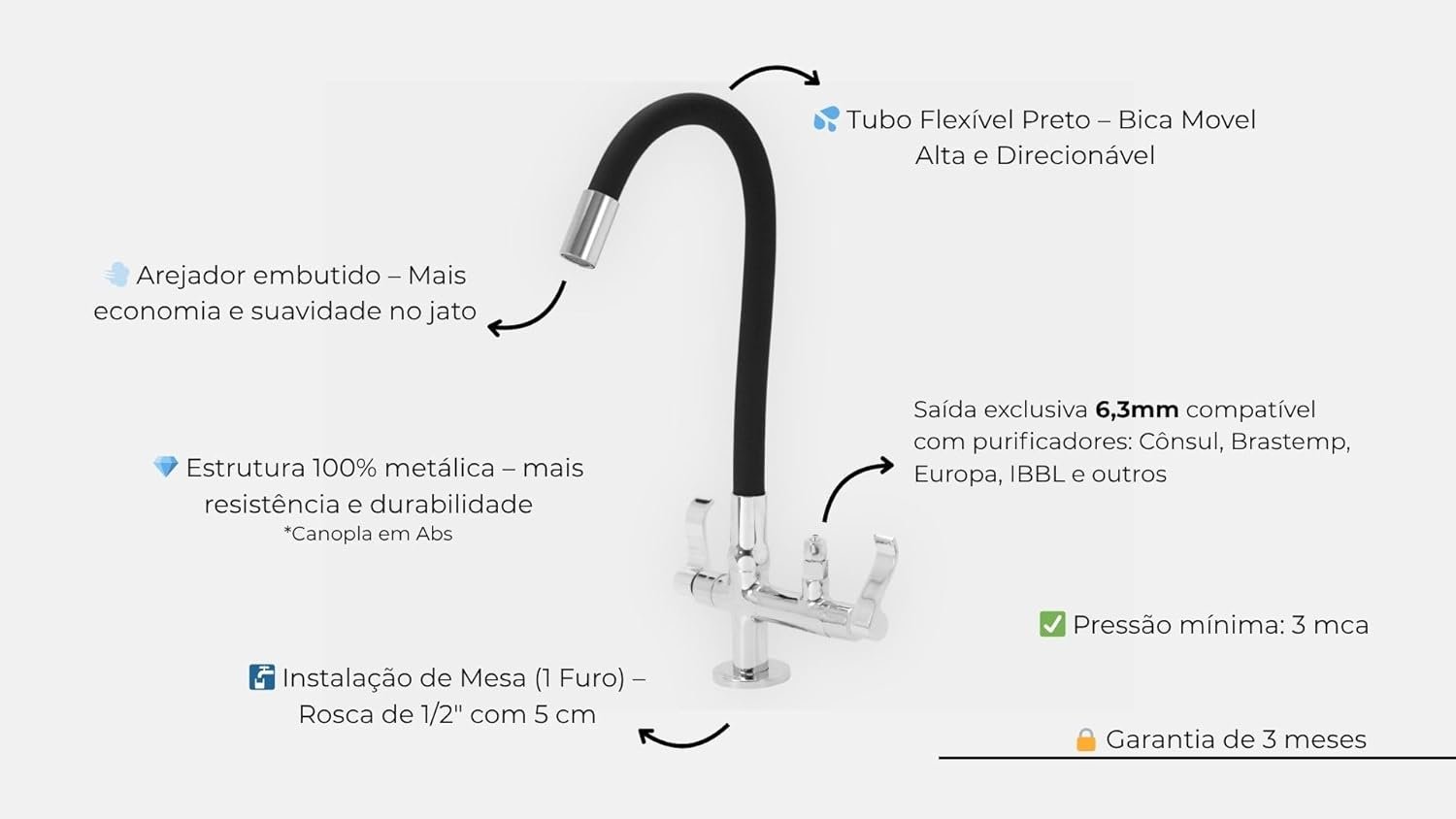 Com a Torneira Flexível de Mesa Samer, você terá praticidade e elegância na sua cozinha. A saída para purificador de água facilita o uso diário, enquanto o tubo preto e o acionamento de 1/4 de volta garantem durabilidade e sofisticação. Adquira já a sua e transforme sua rotina!