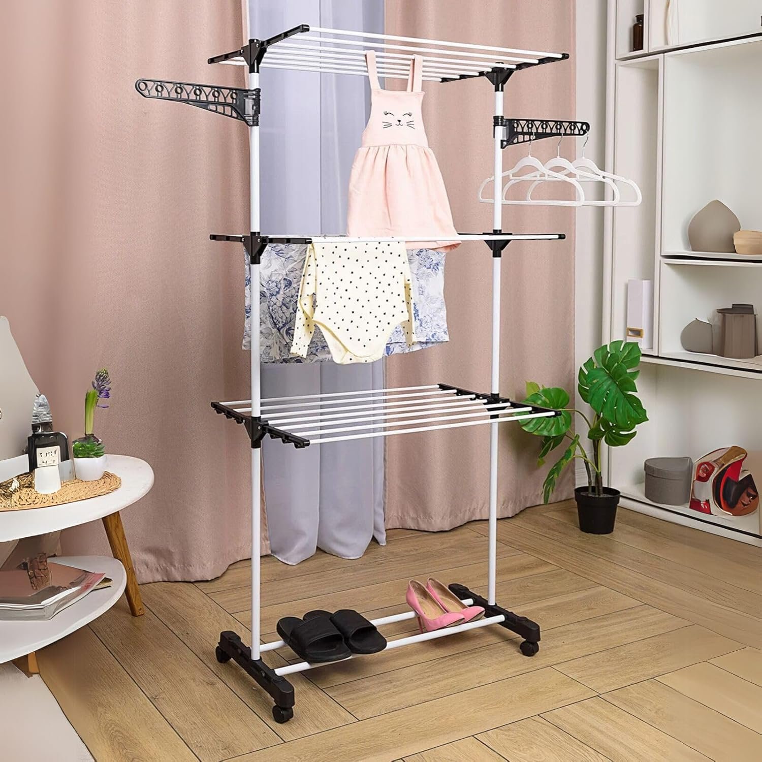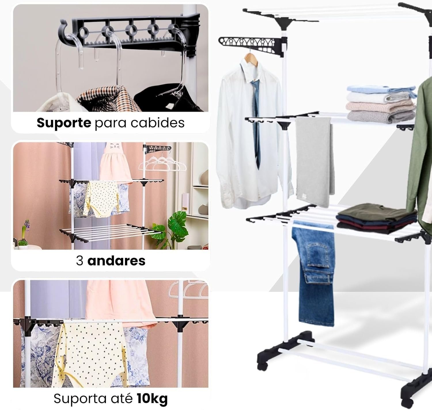 Varal De Chão 3 Andares Grande de Roupas Dobrável Regulável Retrátil com Rodinhas e Ganchos Compacto