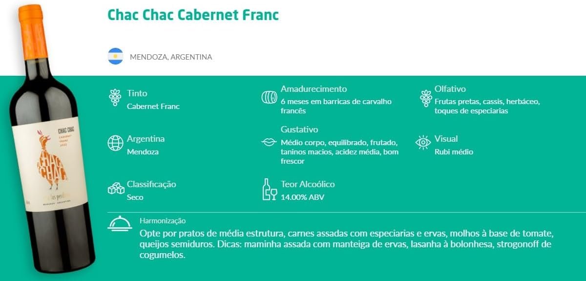 Vinho Tinto Argentino Chac Chac Cabernet Franc 750 mlVinho Tinto Argentino Chac Chac Cabernet Franc 750 ml