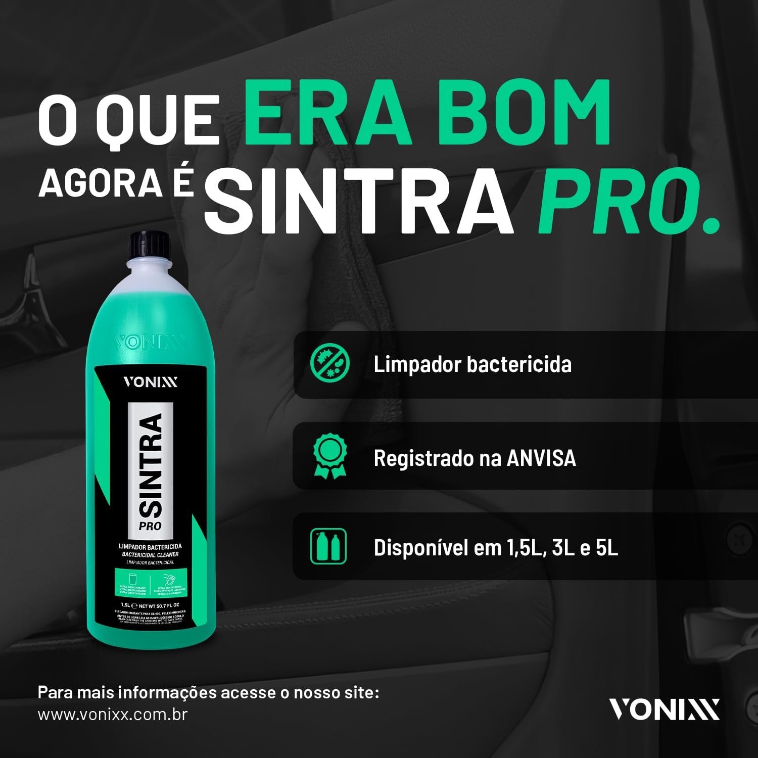 Transforme a limpeza do interior do seu veículo com o poderoso Limpador Bactericida Sintra Pro da vonixx. Com sua fórmula exclusiva, elimina germes, bactérias e odores indesejados, deixando um ambiente mais saudável para você e sua família. A embalagem de 1,5 litros garante economia e praticidade. Leve já o Sintra Pro e garanta um cuidado completo para o seu carro!