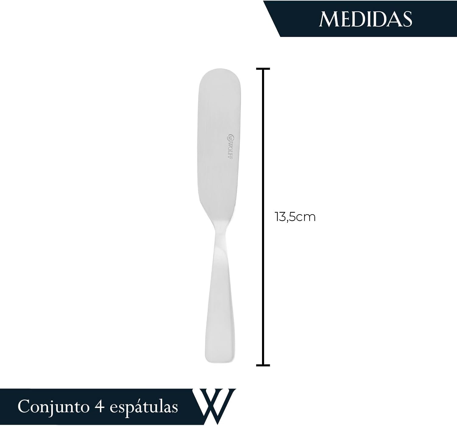 Descrição: Adquira agora o Conjunto de 4 Espátulas de Aço Inox da Wolff e tenha em mãos utensílios de alta qualidade e durabilidade para facilitar suas tarefas na cozinha. Com lâminas resistentes e cabo ergonômico, essas espátulas são ideais para uso diário e vão tornar o preparo de suas receitas muito mais prático e preciso.